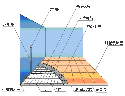低温辐射发热电缆采暖系统由地热电缆和温控器两部分组成,地热电缆铺设于地面中,温控器安装于墙面上。